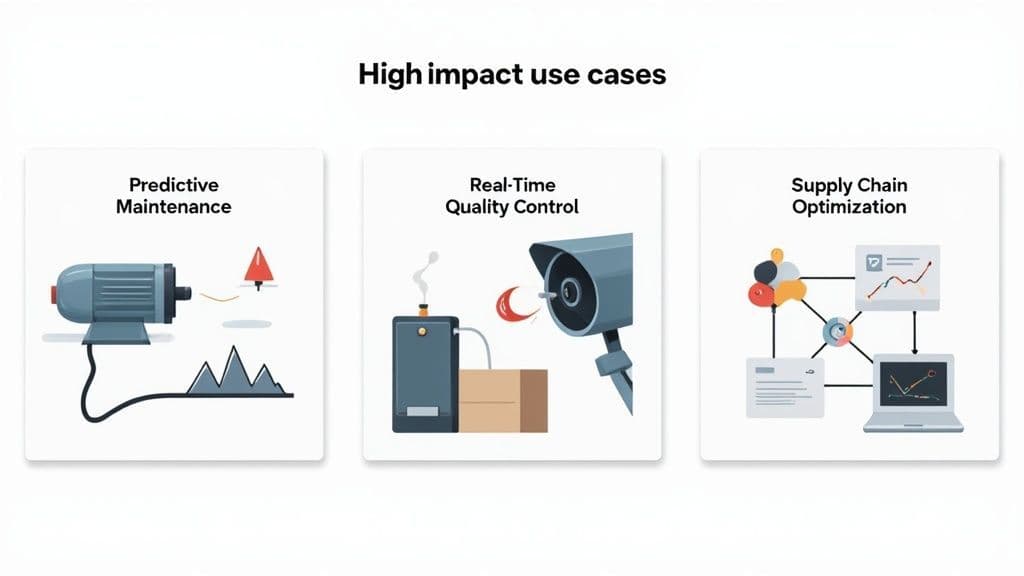By applying analytics for manufacturing to a few specific, high-impact areas, you can generate a clear and rapid return. We’ll dig into three of the heaviest hitters: predictive maintenance, real-time quality control, and supply chain optimization. Each one tackles a common operational headache with a powerful data-driven solution.