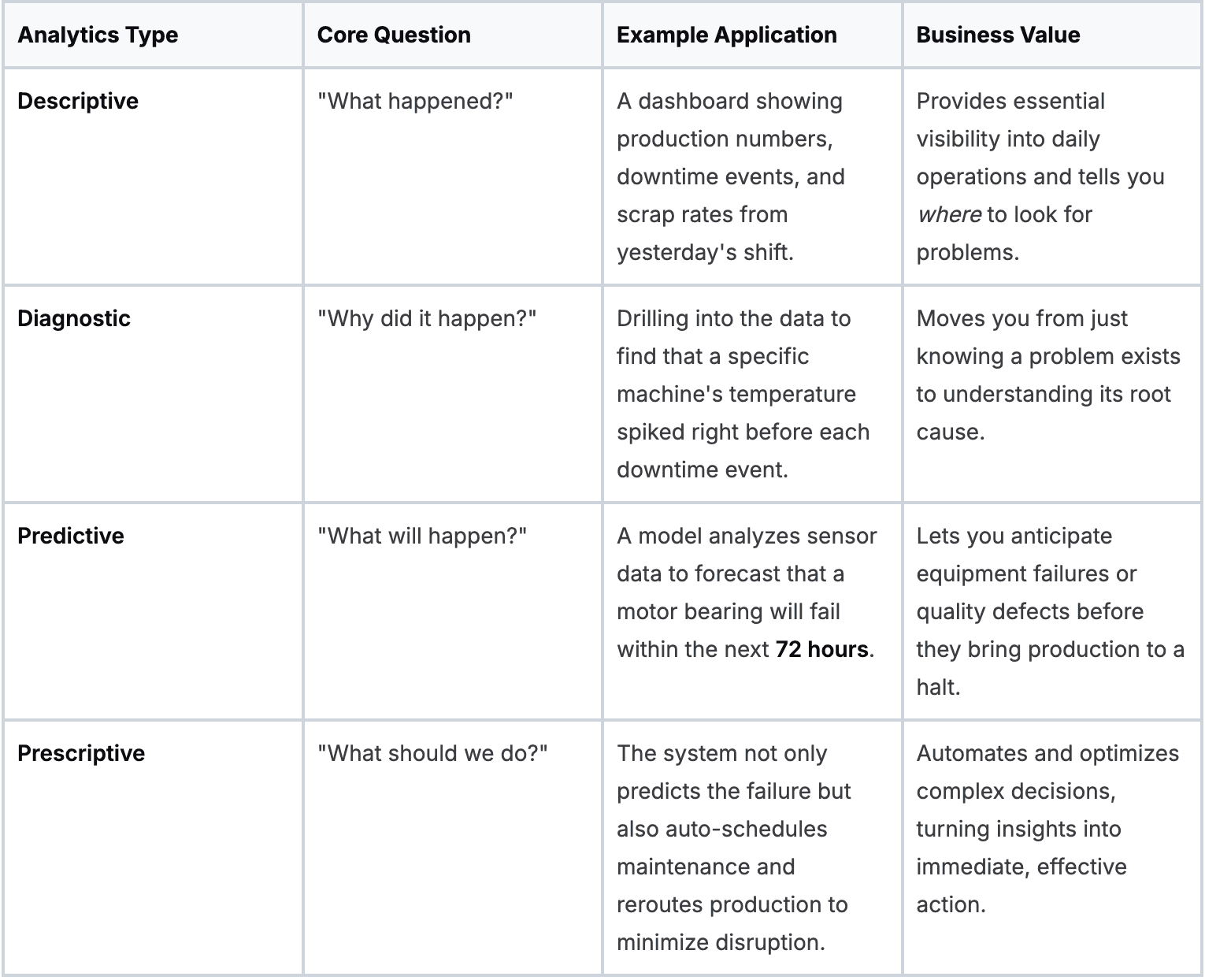 To make this crystal clear, let's break down the four types of analytics, what they do, and what they look like on the factory floor.