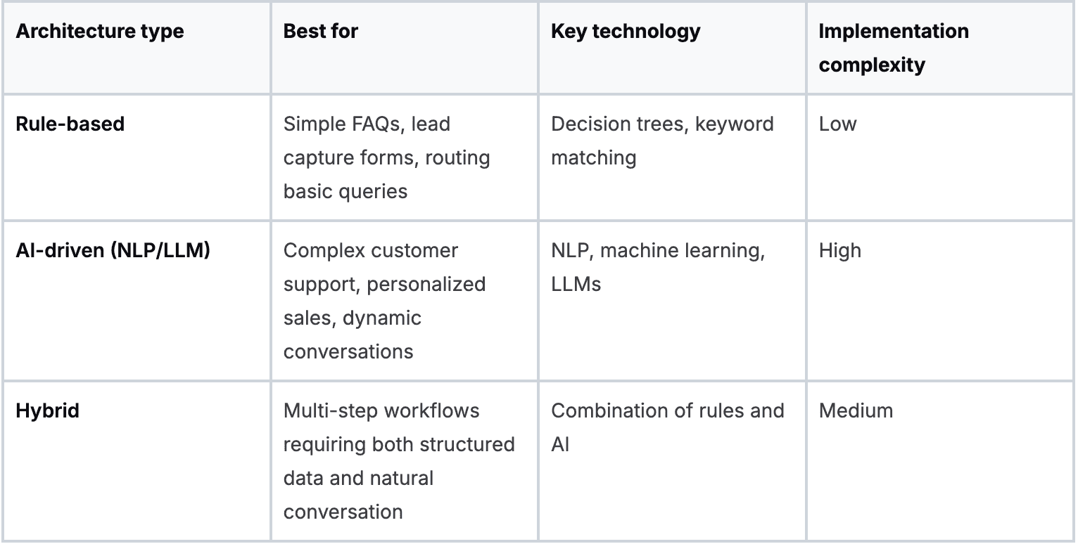 Not all chatbots are created equal. The right architecture for you depends on what you're trying to achieve. A chatbot development partner will guide you, but it’s smart to know the main options.