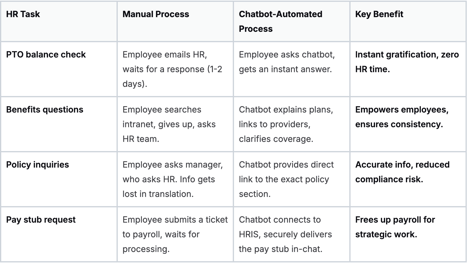 Instead of your HR team answering the same questions about direct deposit or VPN access over and over, the chatbot offers instant, step-by-step instructions.