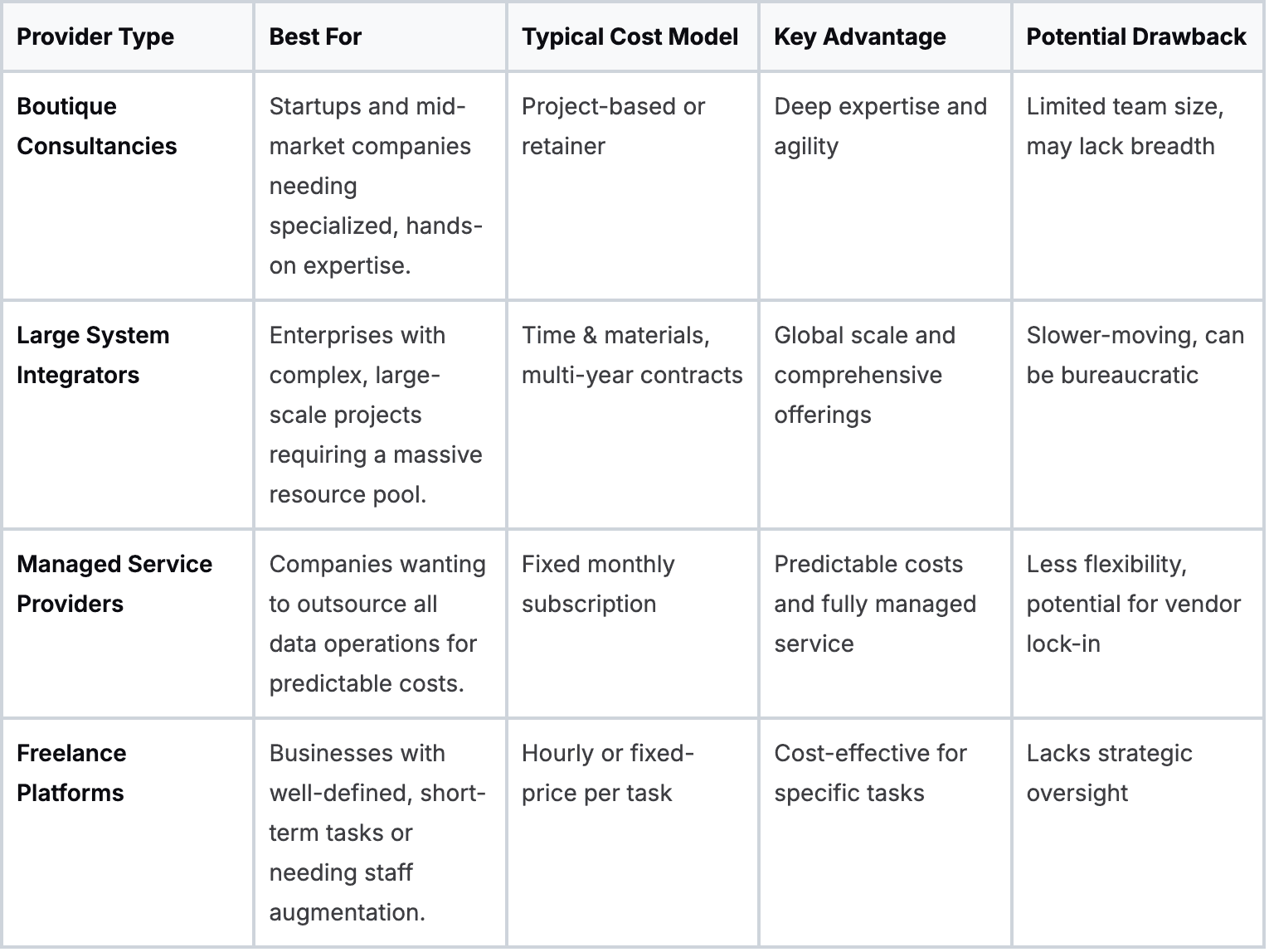 Choosing the right partner also means understanding the different types of providers. A large enterprise has different needs than a fast-moving startup. This table breaks down the common options.