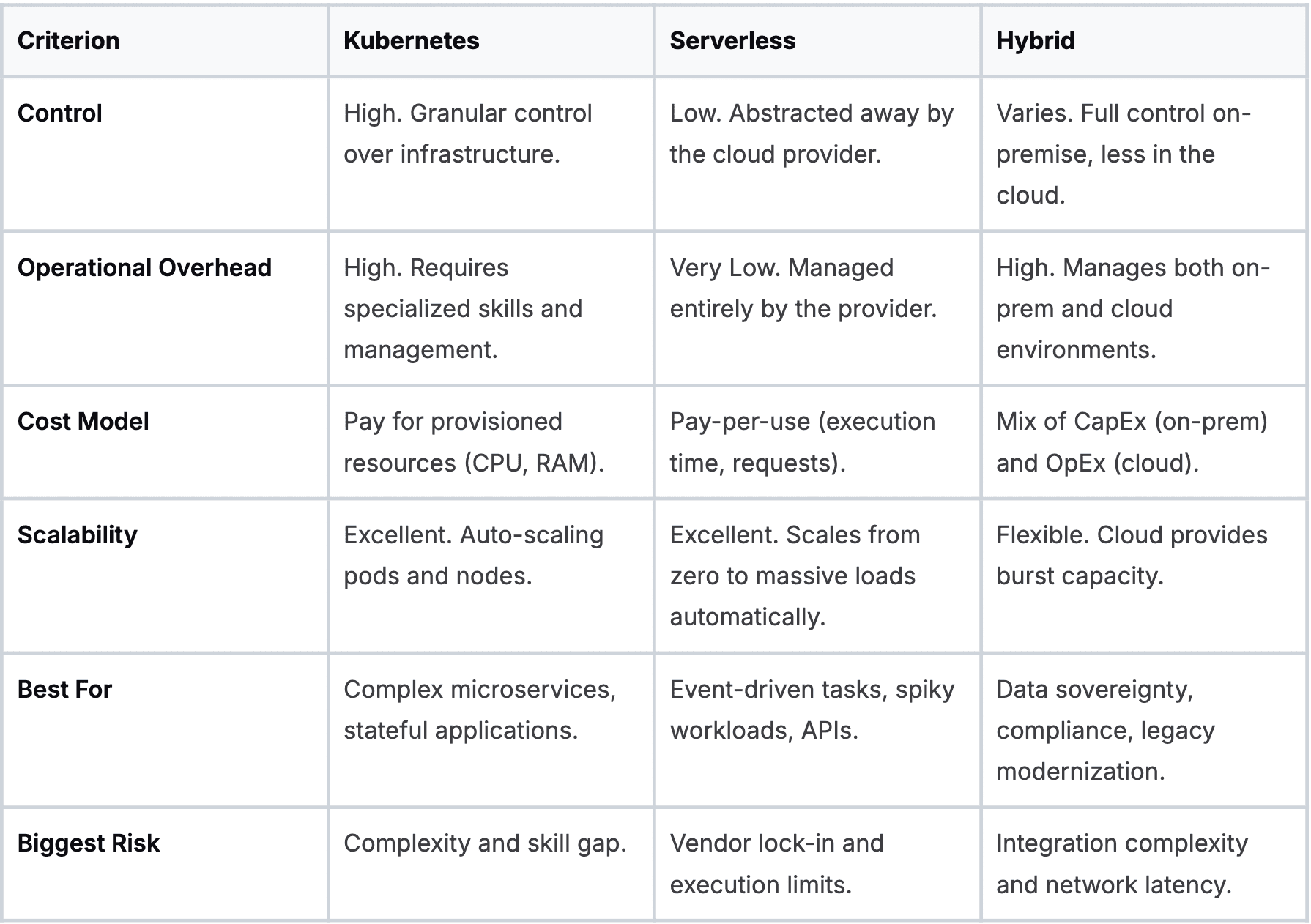 The goal is to align your architecture with your product roadmap. Let's cut through the hype around the three dominant models: Kubernetes, serverless, and hybrid.